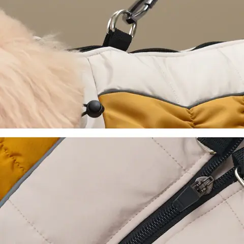 Fermuar detayları, güçlendirilmiş dikiş yapısı ve tasma bağlamak için eklenen emniyet halkası sayesinde mont hem dayanıklı hem de işlevseldir. Elastik yan paneller rahat bir oturuş sağlar; gövdeyi sararak ısı kaybını azaltır.